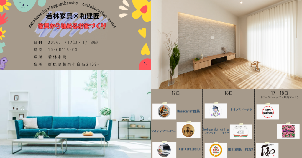 2026.1/17㈯・1/18㈰の2日間、藤岡市の若林家具さんにて、和建匠との初コラボイベントを開催いたします。
